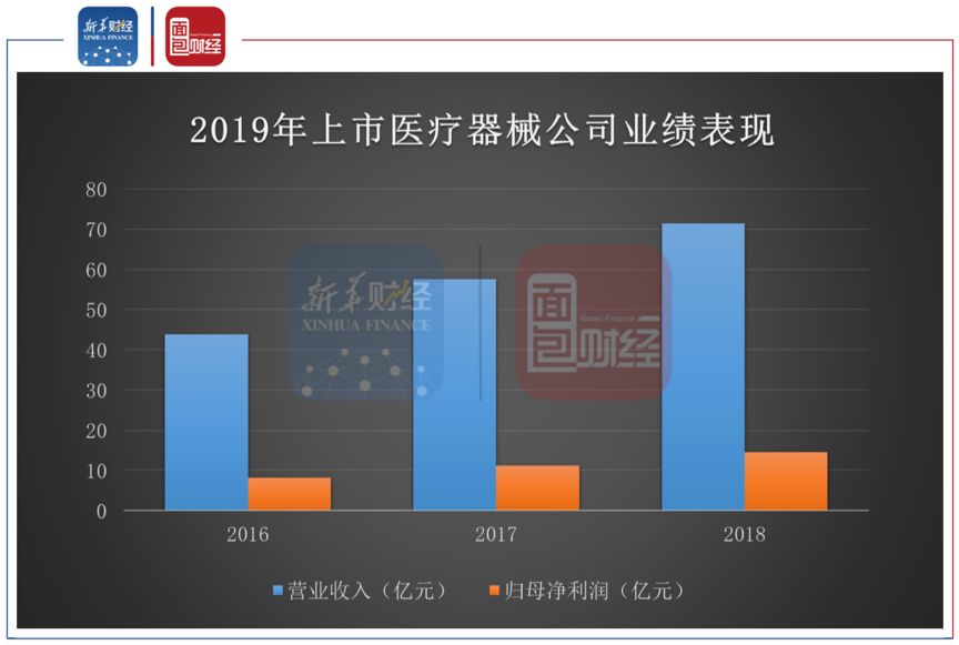 新华财经和面包财经的研究发现,2019年是医疗器械公司集体冲刺资本市场的大年,11家公司在A股成功上市,占当年医疗行业新上市公司数量的六成。