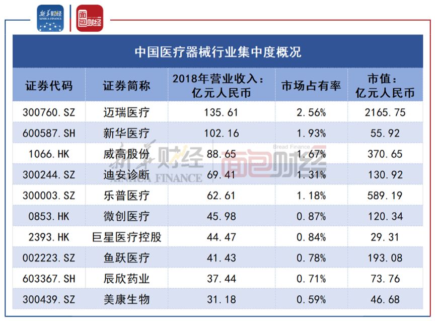 新华财经和面包财经研究员梳理医疗器械行业市场情况发现,尽管行业内已经出现多家收入超过50亿元的上市公司,但行业集中度仍然不高。