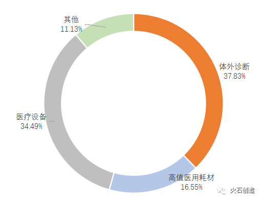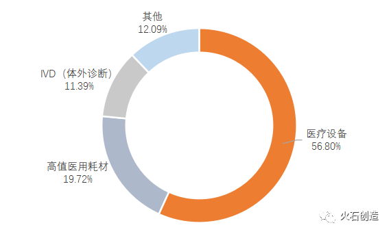 目前,市场上对医疗器械细分市场划分没有统一的标准,本文结合市场内多种划分标准,将医疗器械细分市场分为:高值医用耗材、IVD(体外诊断)、医疗设备及其他。高值医用耗材主要相对低值医用耗材而言,主要是属于医用专科治疗用材料,如心脏介入、外周血管介入、骨科内植介入等医用材料;IVD(体外诊断)产业主要指体外诊断相关产品,包括体外诊断试剂及体外诊断仪器设备;医疗设备是医疗、科研、教学、机构、临床学科工作最基本要素,即包括医用医疗设备,也包括家用医疗设备;其他指除高值医用耗材、IVD(体外诊断)、医疗设备以外的其他医疗器械。