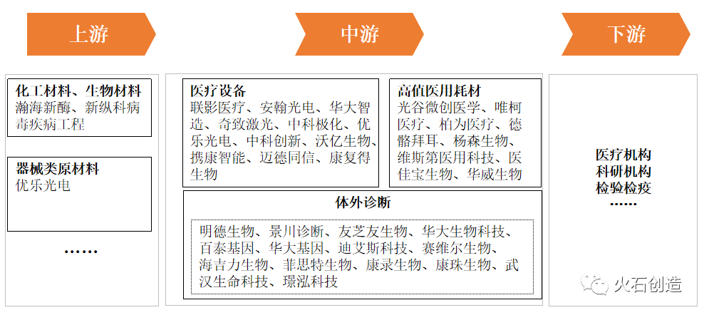 依托武汉市光电产业、新材料产业等基础优势,武汉市积聚了一批医疗器械创新企业。从产业链看,上游原材料积聚瀚海新酶、新纵科病毒疾病工程等企业,中游研发生产在医疗设备、体外诊断、高值医用耗材重点细分领域积聚安翰光电、华大智造、光谷微创医学、明德生物等一批重点创新型企业代表,形成了覆盖研发生产流通的医疗器械产业生态体系。