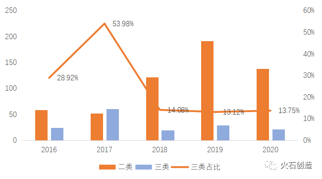 图8 2016-2020年武汉市首次获批二三类医疗器械数量及三类产品占比(个)