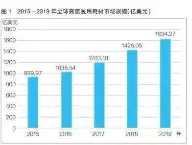 随着医疗产业的高速发展,全球高值医用耗材市场规模增长迅速。2019年,全球高值医用耗材行业市场规模达1634.27亿美元(见图1),2015~2019年的年复合年增长率为14.83%。