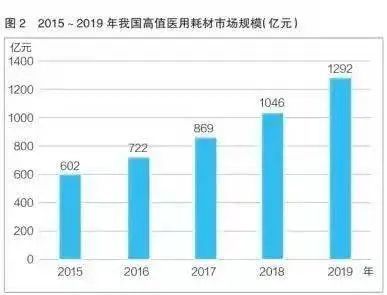 近年来,我国高值医用耗材行业紧密结合产业上下游资源,充分掌握用户需求变化,丰富应用场景,带来耗材需求的逐年增长。2015年,我国高值医用耗材行业市场规模为602亿元,2019年增长至1292亿元(见图2),2015~2019年的年复合增长率为21.04%。2020年,受新冠肺炎疫情影响,高值医用耗材需求急剧增长,市场规模有望突破1600亿元。预计2026年,我国高值医用耗材市场规模将达3356亿元,但受带量采购、进口替代等因素影响,市场增速将逐年趋缓。