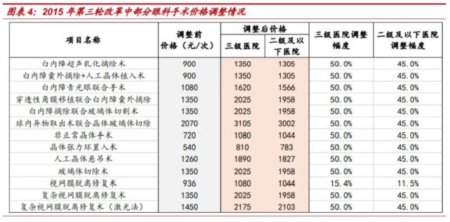 诊查治疗费、手术费和其他体现医务人员技术劳务价值的医疗服务项目价格普遍上调,平均整体上调幅度在20%~30%左右。以调整幅度和范围最广的2015年第三轮调整为例,白内障、玻璃体切除、视网膜修复等部分眼科手术三级医院价格上调50%、二级及以下医院上调45%,整体调价幅度可观。