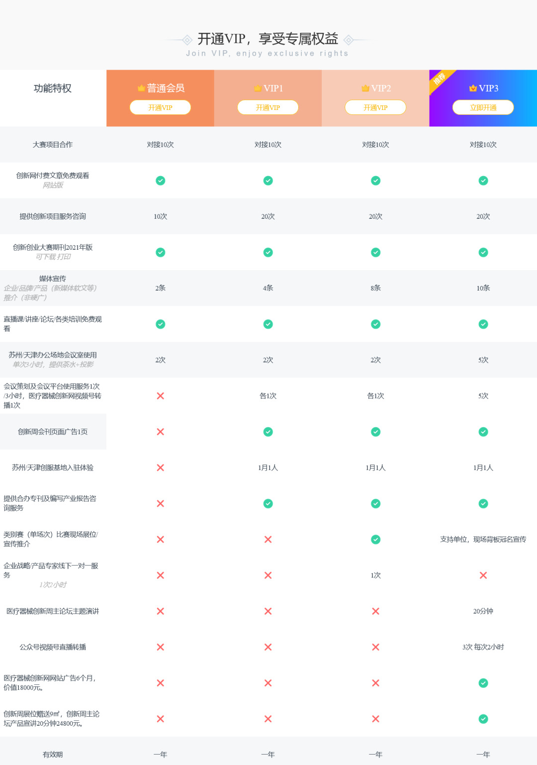 医疗器械创新网(www.innomd.org)是依托国家医疗器械产业技术创新联盟和中国医疗器械行业协会创新服务专委会,由苏州医疗器械创新服务中心等若干业内知名创服机构共同运营的专注于医疗器械创新服务的新媒体,主要为医疗器械创新项目提供路演融资、设计代工、专利服务等多项研产销环节的专业外包服务,创新网组织专家及各类创新服务资源共同打造苏州(上海、天津)医疗器械创新服务基地,一站式开展上述各项服务。创新网还与国家医疗器械产业技术创新联盟共同举办中国医疗器械创新创业大赛,该大赛为“科创中国”系列活动,是国内器械领域水准最高影响最大的顶级品牌赛事,举办四届共2386个中外创新项目参赛,2000余家企业、投资者、专家和创新人士逾4万人次现场参与,253个获奖项目半年融资逾52亿元。 ·加入会员解锁更多功能· ·创新项目专属对接 ·企业全媒体宣传推广 ·专家一对一咨询服务 ·创新论坛主题演讲 ·企业直播宣传转播 ·创新网站企业品牌推广 ·专业化会议场地 ·投资项目调研服务 ·创新周展位超多展示平台 开通VIP,享受专属权益 加入会员指南→ 丨1.打开医疗器械创新网官方网站(www.innomd.org)右上角的加入会员,了解更多会员权益。 丨2. 点击右上角 注册/登陆(首次登陆需注册账号); 丨3. 注册登陆后,选择功能特权等级,选择相对应的开通VIP按钮,付费成功后即可拥有相应的VIP功能权限; MAY DAY 特别提醒: (记得添加您的专属客服) 付款完成后,页面会跳转至添加专属客服页面,请及时添加您的专属客服,为您提供开发票及后续服务对接内容。 详情请咨询客服热线:0512-67888227、18912606905。