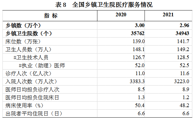 2021年底,全国2.96万个乡镇共设3.5万个乡镇卫生院,床位141.7万张,卫生人员149.2万人(其中卫生技术人员128.5万人)。与上年比较,乡镇卫生院减少819个,床位增加2.7万张,人员增加1.1万人(见表8)。