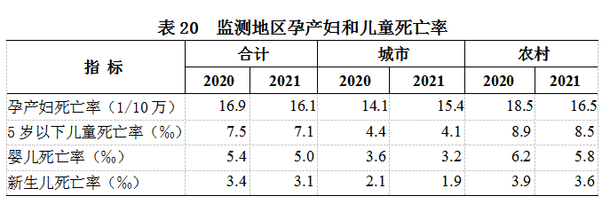 (三)孕产妇死亡率。据全国妇幼健康监测,2021年,全国孕产妇死亡率为16.1/10万,其中:城市15.4/10万,农村16.5/10万。与上年相比,全国孕产妇死亡率有所下降(见表20)。