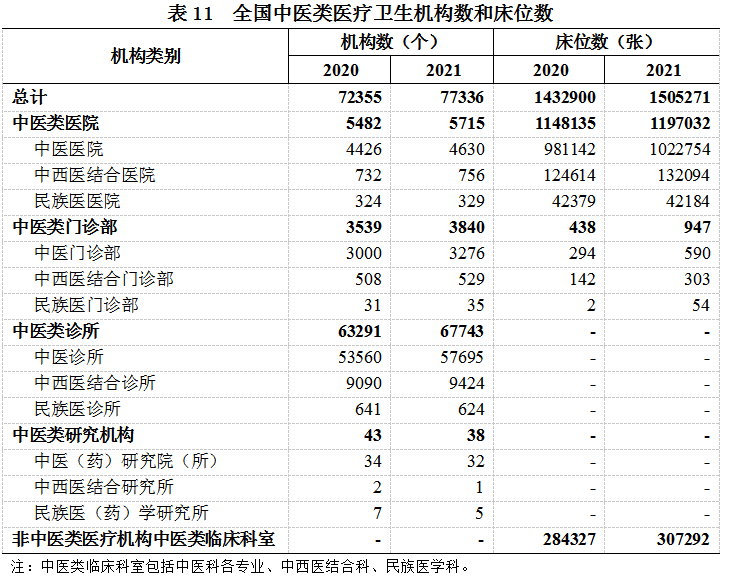 (一)中医类机构、床位及人员数。2021年,全国中医类医疗卫生机构总数77336个,比上年增加4981个。其中:中医类医院5715个,中医类门诊部、诊所71583个,中医类研究机构38个。与上年比较,中医类医院增加233个,中医类门诊部及诊所增加4753个(见表11)。