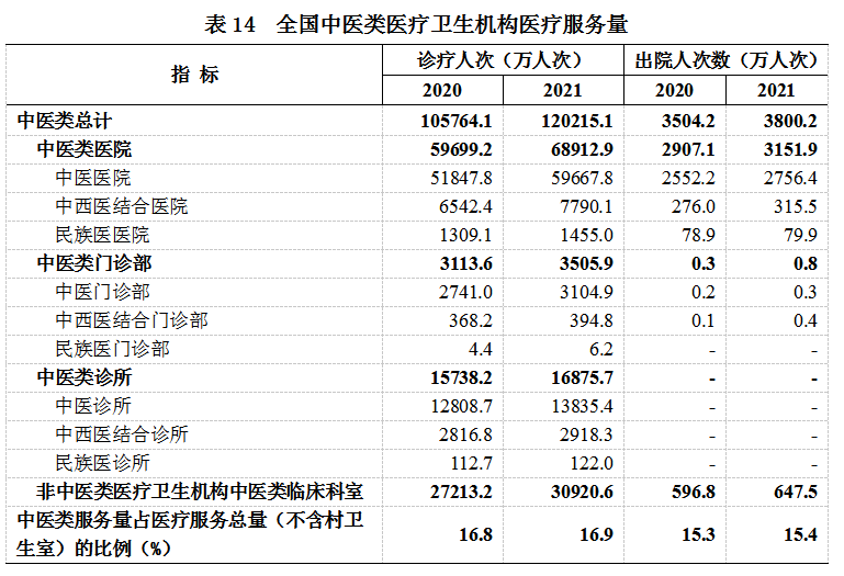 (二)中医医疗服务。2021年,全国中医类医疗卫生机构总诊疗人次12.0亿,比上年增加1.4亿人次(增长13.7%)。其中:中医类医院6.9亿人次(占57.3%),中医类门诊部及诊所2.0亿人次(占17.0%),非中医类医疗机构中医类临床科室3.1亿人次(占25.7%)。