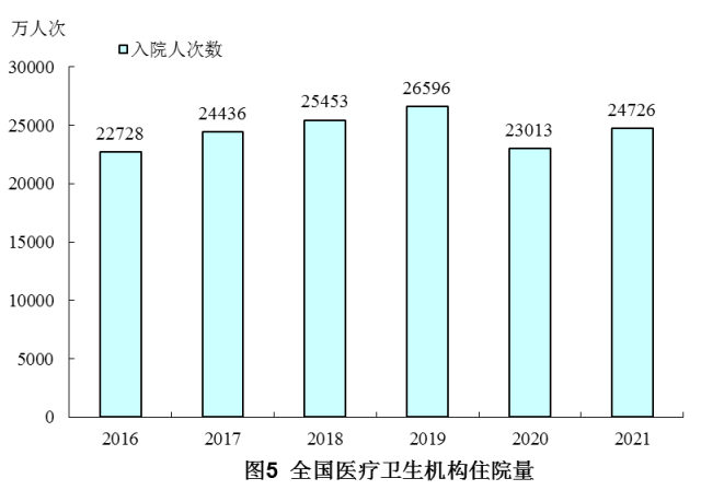 2021年,全国医疗卫生机构入院人次24726万,比上年增加1713万人次(增长7.4%),居民年住院率为17.5%。