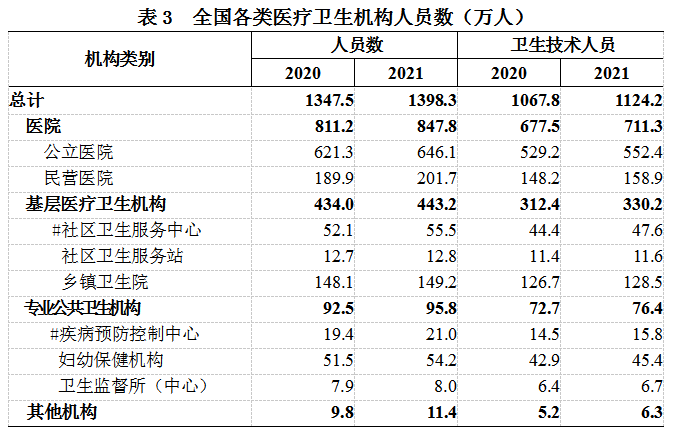 (三)卫生人员总数。2021年末,全国卫生人员总数1398.3万人,比上年增加50.8万人(增长3.8%)。