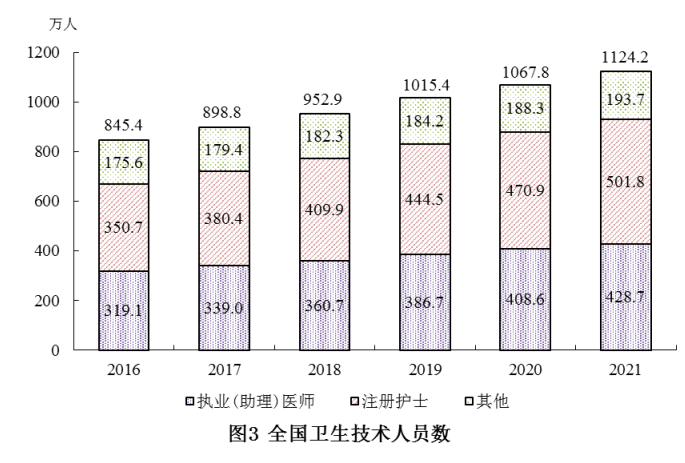 2021年末卫生人员总数中,卫生技术人员1124.2万人。卫生技术人员中,执业(助理)医师428.7万人,注册护士501.8万人。与上年比较,卫生技术人员增加56.4万人(增长5.3%)(见表2)。