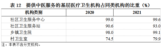 2021年,提供中医服务的社区卫生服务中心占同类机构的99.6%,社区卫生服务站占93.0%,乡镇卫生院占99.1%,村卫生室占79.9%(见表12)。