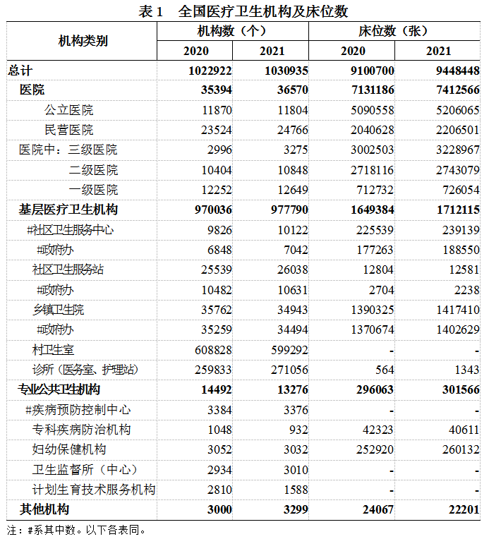 (一)医疗卫生机构总数。2021年末,全国医疗卫生机构总数1030935个,比上年增加8013个。其中:医院36570个,基层医疗卫生机构977790个,专业公共卫生机构13276个。与上年相比,医院增加1176个,基层医疗卫生机构增加7754个。全国共设置10个类别的国家医学中心和儿童类别的国家区域医疗中心。