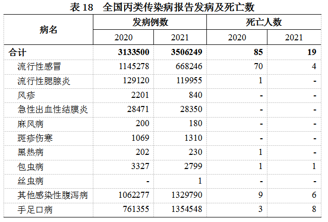 2021年,全国11种丙类传染病共报告发病350.6万例,死亡19人。报告发病数居前5位的病种依次为手足口病、其他感染性腹泻病、流行性感冒、流行性腮腺炎和急性出血性结膜炎,占丙类传染病报告发病总数的99.9%。报告死亡数较多的病种依次为手足口病、其他感染性腹泻病和流行性感冒,占丙类传染病报告死亡总数的94.7%(见表18)。