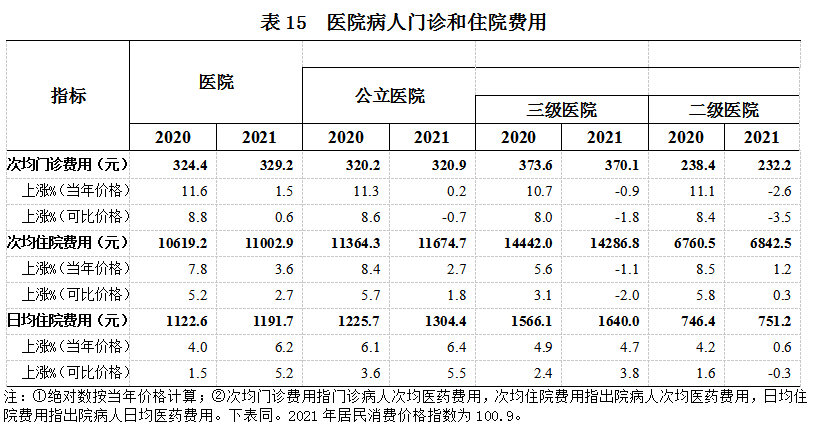 (一)医院病人医药费用。2021年,医院次均门诊费用329.2元,按当年价格比上年上涨1.5%,按可比价格上涨0.6%;次均住院费用11002.9元,按当年价格比上年上涨3.6%,按可比价格上涨2.7%。日均住院费用1191.7元(见表15)。
