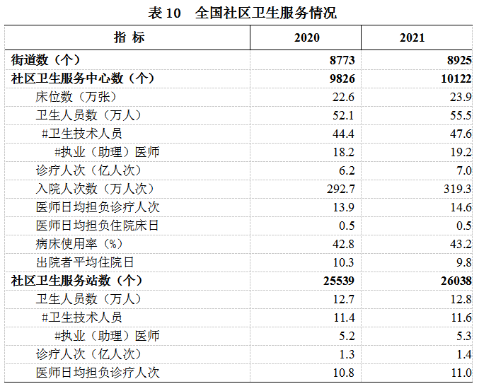 2021年,全国社区卫生服务中心诊疗人次7.0亿,入院人次319.3万;平均每个中心年诊疗量6.9万人次,年入院量315人次;医师日均担负诊疗14.6人次、住院0.5床日。2021年,全国社区卫生服务站诊疗人次1.4亿,平均每个站年诊疗量5379人次,医师日均担负诊疗11.0人次(见表10)。