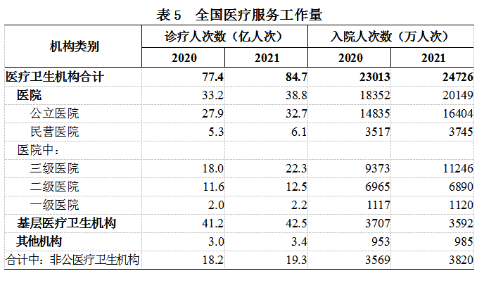 2021年公立医院诊疗人次32.7亿(占医院总诊疗人次的84.2%),民营医院诊疗人次6.1亿(占医院总诊疗人次的15.8%)(见表5)。