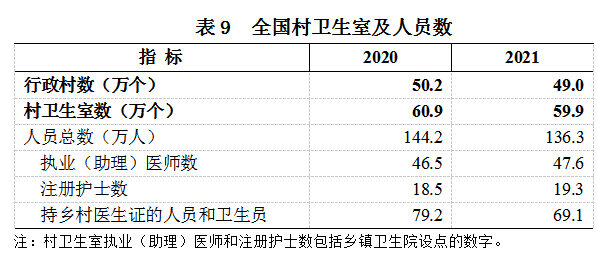 2021年底,全国49.0万个行政村共设59.9万个村卫生室。在村卫生室工作的人员136.3万人,其中:执业(助理)医师47.6万人、注册护士19.3万人、持乡村医生证的人员和卫生员69.1万。与上年比较,村卫生室数减少1.0万个,执业(助理)医师增加1.1万人(见表9)。