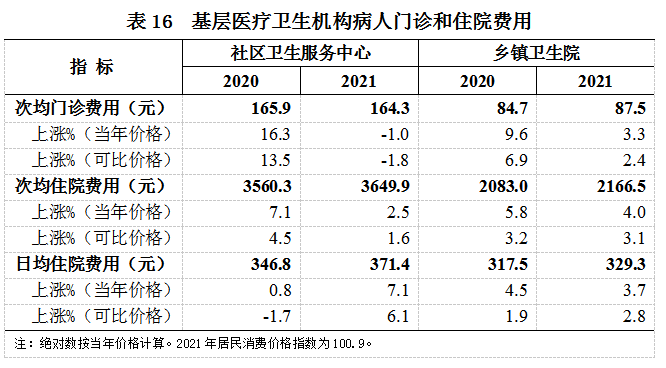 (二)基层医疗卫生机构病人医药费用。2021年,社区卫生服务中心次均门诊费用164.3元,按当年价格比上年下降1.0%,按可比价格下降1.8%;次均住院费用3649.9元,按当年价格比上年上涨2.5%,按可比价格上涨1.6%(见表16)。
