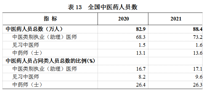 2021年,全国中医药卫生人员总数达88.4万人,比上年增加5.5万人(增长6.6%)。其中:中医类别执业(助理)医师73.2万人,中药师(士)13.6万人。两类人员较上年均有所增加(见表13)。