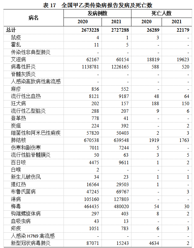 (二)传染病报告发病和死亡。2021年,全国甲、乙类传染病报告发病272.7万例,报告死亡2.2万人。报告发病数居前5位的是病毒性肝炎、肺结核、梅毒、淋病和布鲁氏菌病,占甲乙类传染病报告发病总数的93.3%。报告死亡数居前五位的是艾滋病、肺结核、病毒性肝炎、狂犬病、流行性出血热,占甲乙类传染病报告死亡总数的99.7%(见表17)。