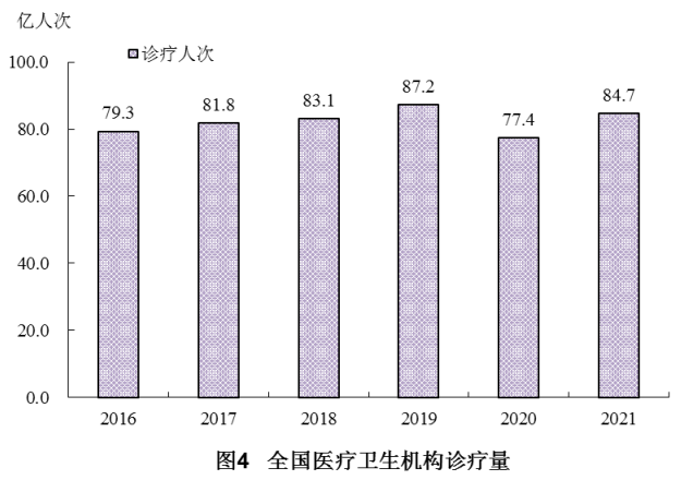 (一)门诊和住院量。2021年,全国医疗卫生机构总诊疗人次84.7亿,比上年增加7.3亿人次(增长9.4%)。2021年居民平均到医疗卫生机构就诊6.0次。