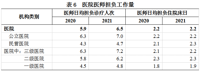 (二)医院医师工作负荷。2021年,医院医师日均担负诊疗6.5人次、住院2.2床日,其中:公立医院医师日均担负诊疗7.0人次、住院2.2床日(见表6)。
