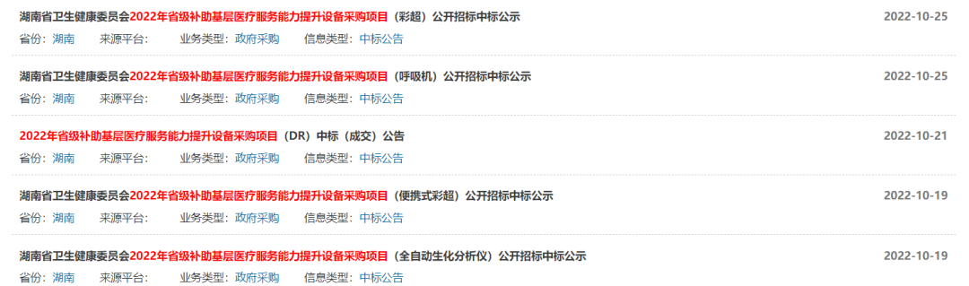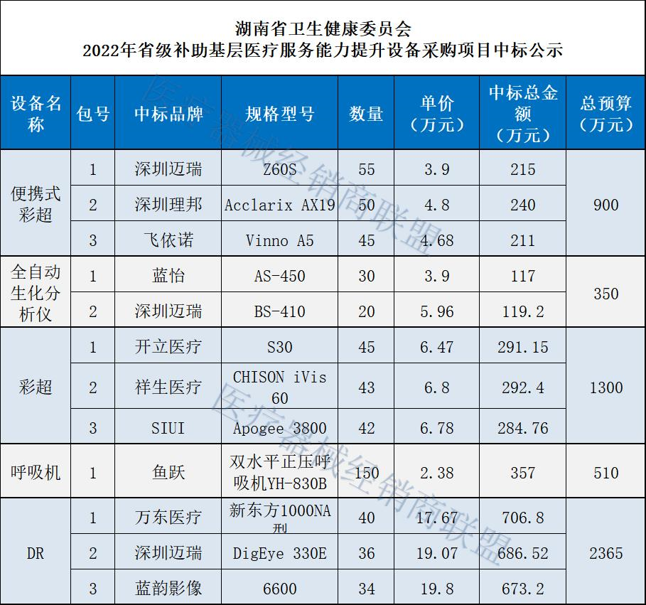 省级设备采购大单,迈瑞、万东、理邦、鱼跃... 近期,据政府采购网了解,湖南省卫生健康委员会2022年省级补助基层医疗服务能力提升设备采购项目中标结果相继出炉! 640台医疗设备,总预算5725万元,根据此前招标公告,本次采购依旧拒绝进口产品产品,只要国产! 据中标公告显示,2022年度湖南省涉及采购的医疗设备包括:110台DR、130台彩超、150台便携式彩超、150台呼吸机、50台血球仪、50台全自动生化分析仪。 除血球,其余五类设备总预算5425万,最终中标价格仅4193万。与往年相比,DR、彩超、便携式彩超等影像设备采购量只增不减,足以看出基层医疗对这类设备的配置需求,而血球、生化等检验检测设备采购数量却有所降低。 无疑,随着公立医疗机构财政预算不断缩减,医疗设备的采购预算也在不断降低,高性价比的国产医疗设备彻底成为了基层配置的主流! 便携式彩超三个包:1包55台,迈瑞医疗中标,单台价格为3.9万;2包50台,深圳理邦,单台价格为4.8万;3包45台,飞依诺中标,单台价格4.68万。 全自动生化分析仪两个包:1包30台,蓝怡中标,单台价格3.9万;2包20台,迈瑞医疗中标,单台价格5.96万。 彩超三个包:1包45台,开立医疗中标,单台价格6.47万;2包43台,祥生医疗中标,单台价格6.8万;3包42台,SIUI中标,单台价格6.78万。 呼吸机一个包:1包150台,鱼跃医疗中标,单台价格2.38万。 DR三个包:1包40台,万东医疗中标,单台价格17.67万;2包36台,迈瑞医疗中标,单台价格19.07万;3包34台,蓝韵影像中标,单台价格19.8万。 事实上,湖南省已连续多年为基层医疗机构采购设备,DR、彩超等设备几乎是每年的“常客”,从2019年开始,这几大类设备的中标价格逐年降低。 以万东的DR为例,2021年新东方1000NB型中标价为20.66万,而今年新东方1000NA型的价格仅17.67万,再降14.5%。除了DR,彩超、呼吸机等设备单台中标价格也均有很大程度的降低。 按照目前的发展趋势,医疗设备集中带量采购或许还有很长一段路要走,但可以看到,在药品、耗材集采杀价的巨大冲击之下,公立医院传统的设备采购模式正在被逐渐改变。 在公立医院高质量发展的高要求之下,省级、市域联盟集中采购无疑正在成为公立医院中小型医疗设备的主流采购方式。目前,与湖南省做出同样选择的还有海南省、江苏省以及福建省等...