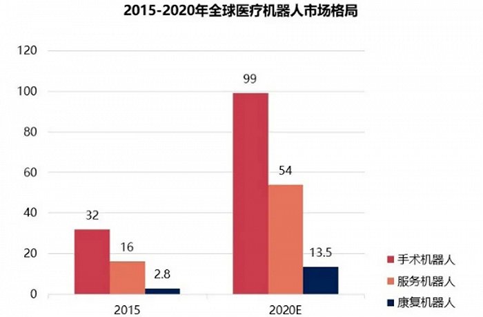 在全球细分市场中,手术机器人占过半份额,康复机器人成增速最快市场。据Grand View Research的统计,2017年手术机器人在医学机器人市场份额已超过60%,预计2021年手术机器人和康复机器人的行业规模分别达到200、32亿美元,年均复合增速将达到29.9%、46.6%。