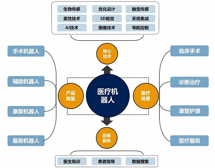 医疗机器人的产业发展,可以从核心技术、产品类型、医疗场景和后端服务四方面来看。除了伺服电机、传感器、控制器、减速机、系统集成等机器人核心技术,医疗机器人的产品开发还涉及生物传感、触觉传感、3D视觉、导航控制等关键技术发展。