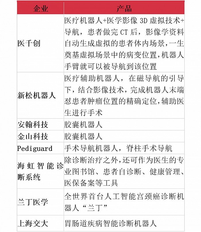 辅助机器人从共性上来说在于扩展医护人员的能力,从全球市场看均处起步期,产品多为中低端辅助治疗培训类。行业基本格局尚未成型,是初创企业入局机会较大的细分领域,目前主要是以欧美高校研发团队以及中国研发团队为主。主要产品类型集中体内药物输送、医护培训机器人、远程诊疗机器人等。
