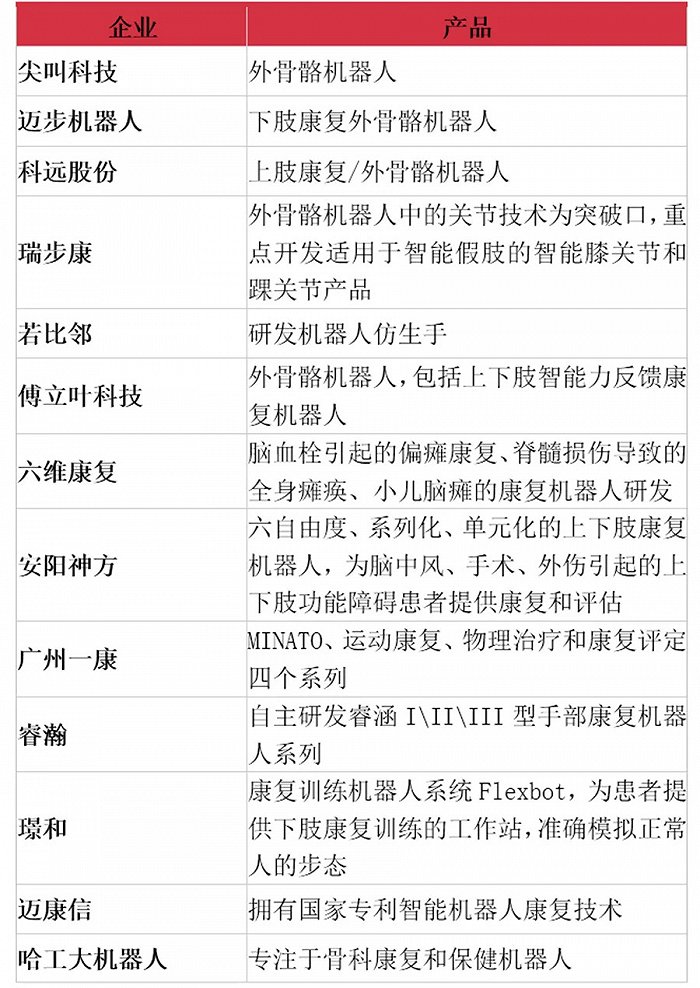 国内企业趋向多病种多领域康复研发。我国康复机器人企业趋向于多病种康复研发,例如沈阳六维康复科技,研发方向聚焦脑血栓引起的偏瘫康复、脊髓损伤导致的全身瘫痪、小儿脑瘫的康复机器人研发;安阳神方聚焦六自由度、系列化、单元化的上下肢康复机器人,为脑中风、手术、外伤引起的上下肢功能障碍患者提供康复和评估。