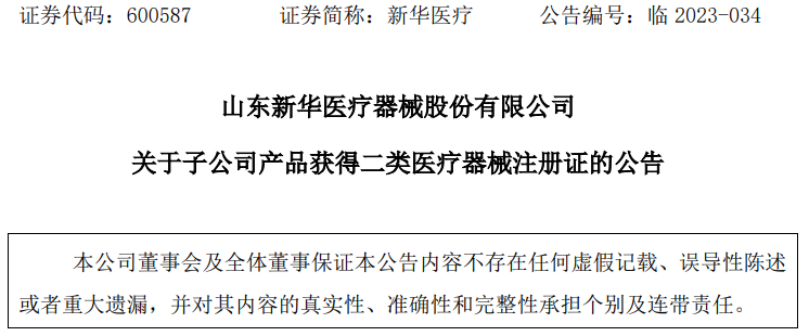 新华医疗(600587)于5月25日发布晚间公告称,山东新华医疗器械股份有限公司(以下简称“公司”或“新华医疗”)子公司新华手术器械有限公司收到山东省药品监督管理局颁发的《中华人民共和国医疗器械注册证》。具体情况如下: