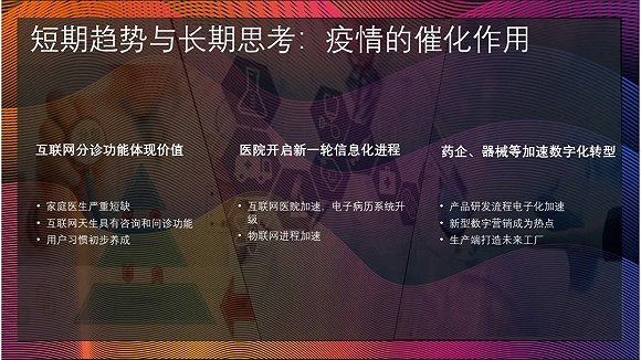 第二是从医院端来看,疫情期间暴露了公立医院在信息化方面的很多问题。我们明显感觉到,今年下半年到明年上半年,可能是一个比较密集招标的年份,很多大型三甲医院在更新电子病历、智能决策系统等。在疫情之后,很多医院在思考如何提升内部运营和患者就医的效率。