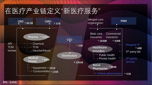 最右边是诊疗服务的提供商,就是医院。围绕着医院有传统的医疗信息化,还有一些新型的信息化,包括第三方实验室、第三方检测、第三方病理服务,这些都会有出现新服务的机会。