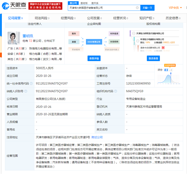 如果说格力造口罩只是面对疫情出于企业责任为之的话,那么现在随着天津格力新晖医疗装备有限公司成立,我们完全有理由相信,格力跨界医疗很是认真。根据天眼查App显示,10月26日,天津格力新晖医疗装备有限公司成立,法定代表人为董明珠,注册资本5000万人民币。