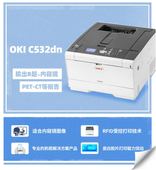 在医疗报告解决方案展区中,OKI展示了C532dn和C711n两款专业医疗行业专用输出设备。其中,C532dn打印机是一款高性能的专业的瓷白胶片输出设备,满足各类内窥镜影像和报告的打印需求,适应医院自助设备的需求,提高了医院的工作效率。