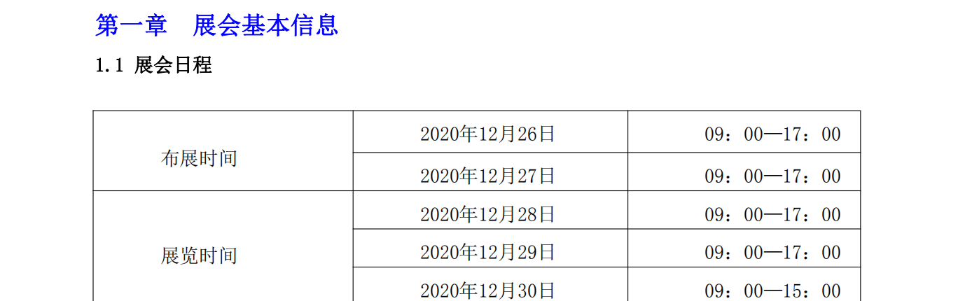 第一章 展会基本信息 1.1 展会日程 ※ 展商:参展人员须于每天开馆前30分钟进馆,闭馆前30分钟内离馆。 ※ 观众:在展览期间,观众每天09:00进馆参观,17:00开始停止入场,12月30日观众 14:30停止入场、15:00开始撤馆。 1.2 参展商领证地址 参展商:凭公司名片及身份证到深圳国际会展中心南登录大厅服务台“参展商报到处” 报到,实名制领取参展证,进馆布置展台。 进场守则:参展商须要展览开放前做好一切准备,按时进馆、离馆。 参展商进场时必须佩带参展证。 参展商布展须严格按照布展时间表进行。 参展商如需申请布展加班请及时申请并交付有关费用,否则无法安排。 布展时间 2020年12月26日 09:00—17:00 2020年12月27日 09:00—17:00 展览时间 2020年12月28日 09:00—17:00 202